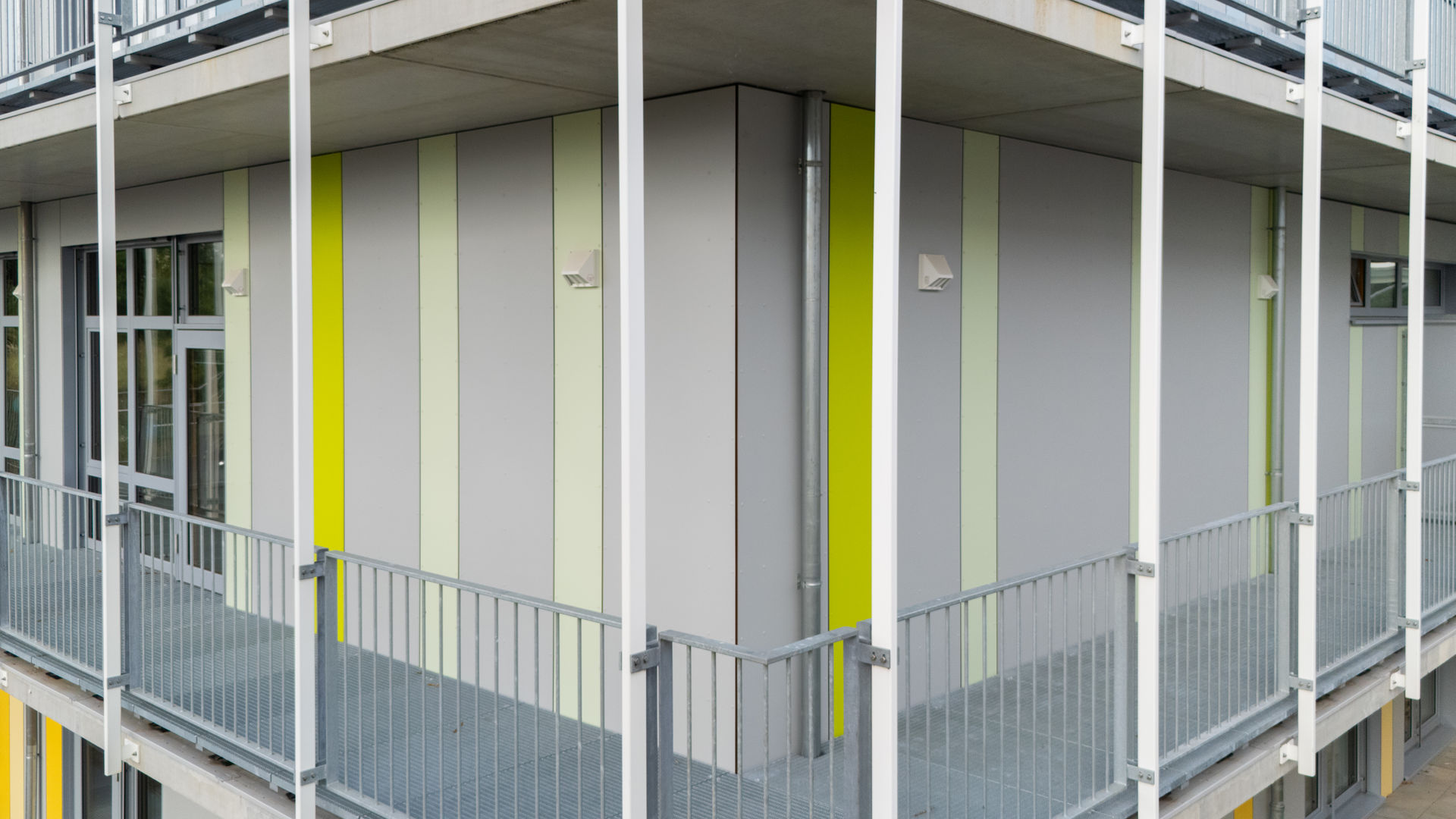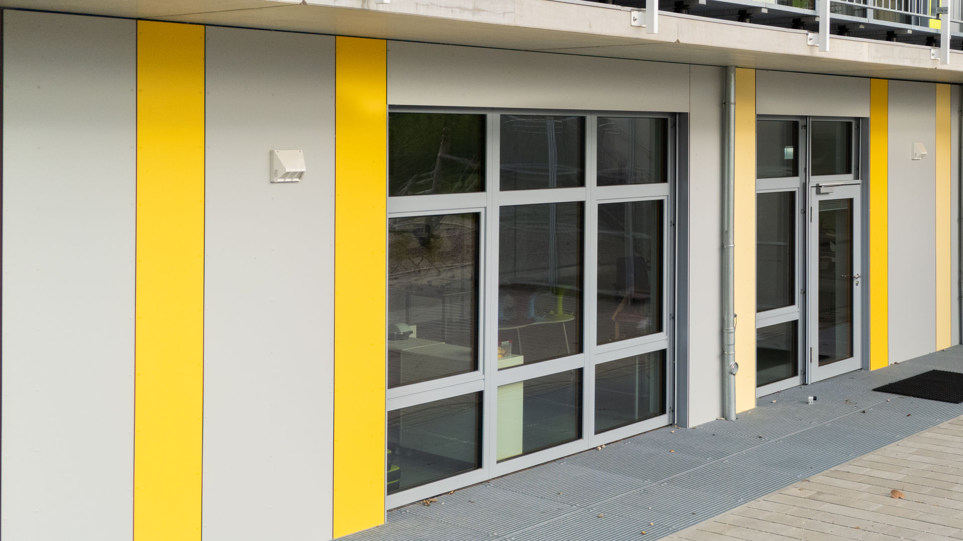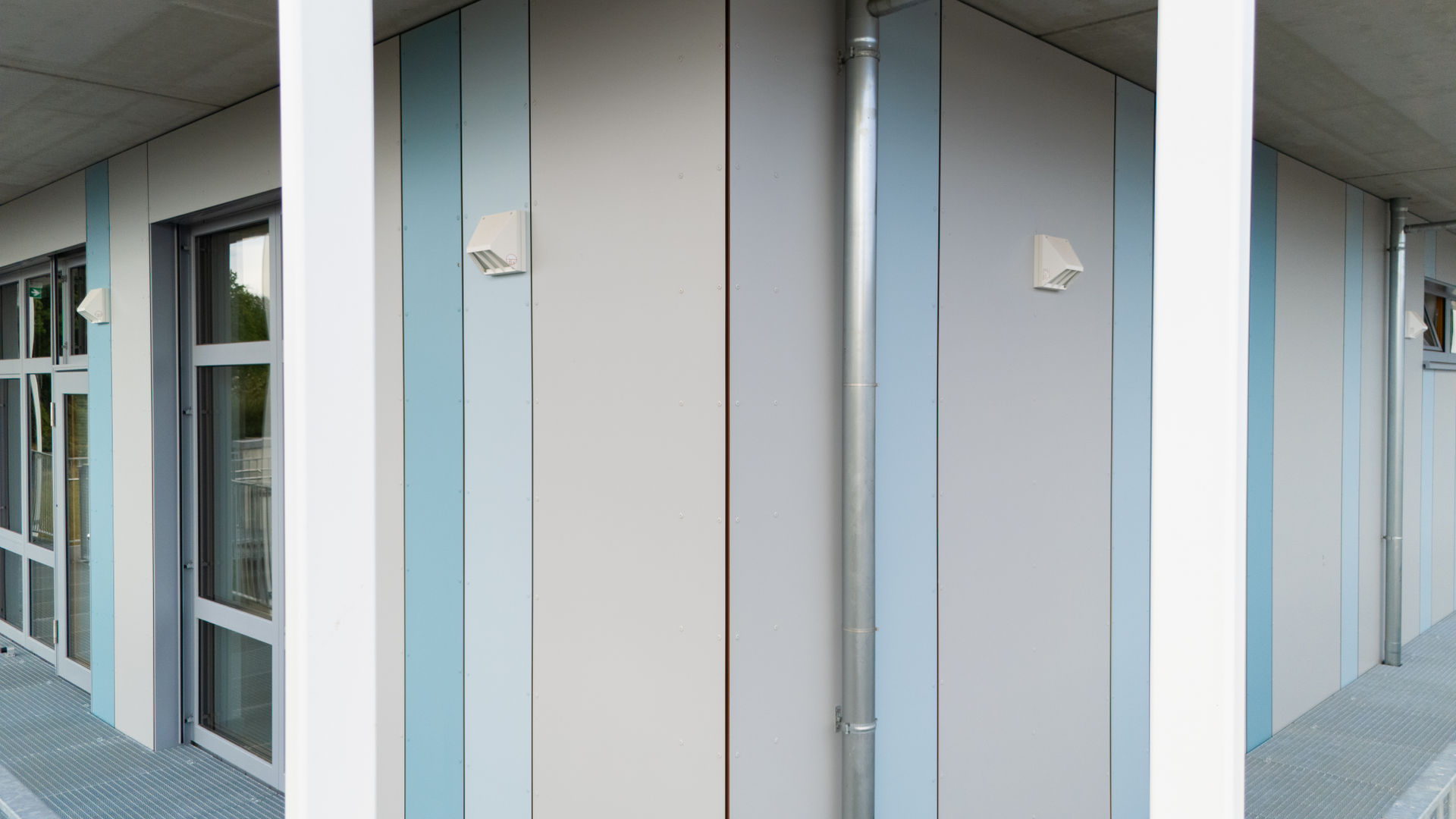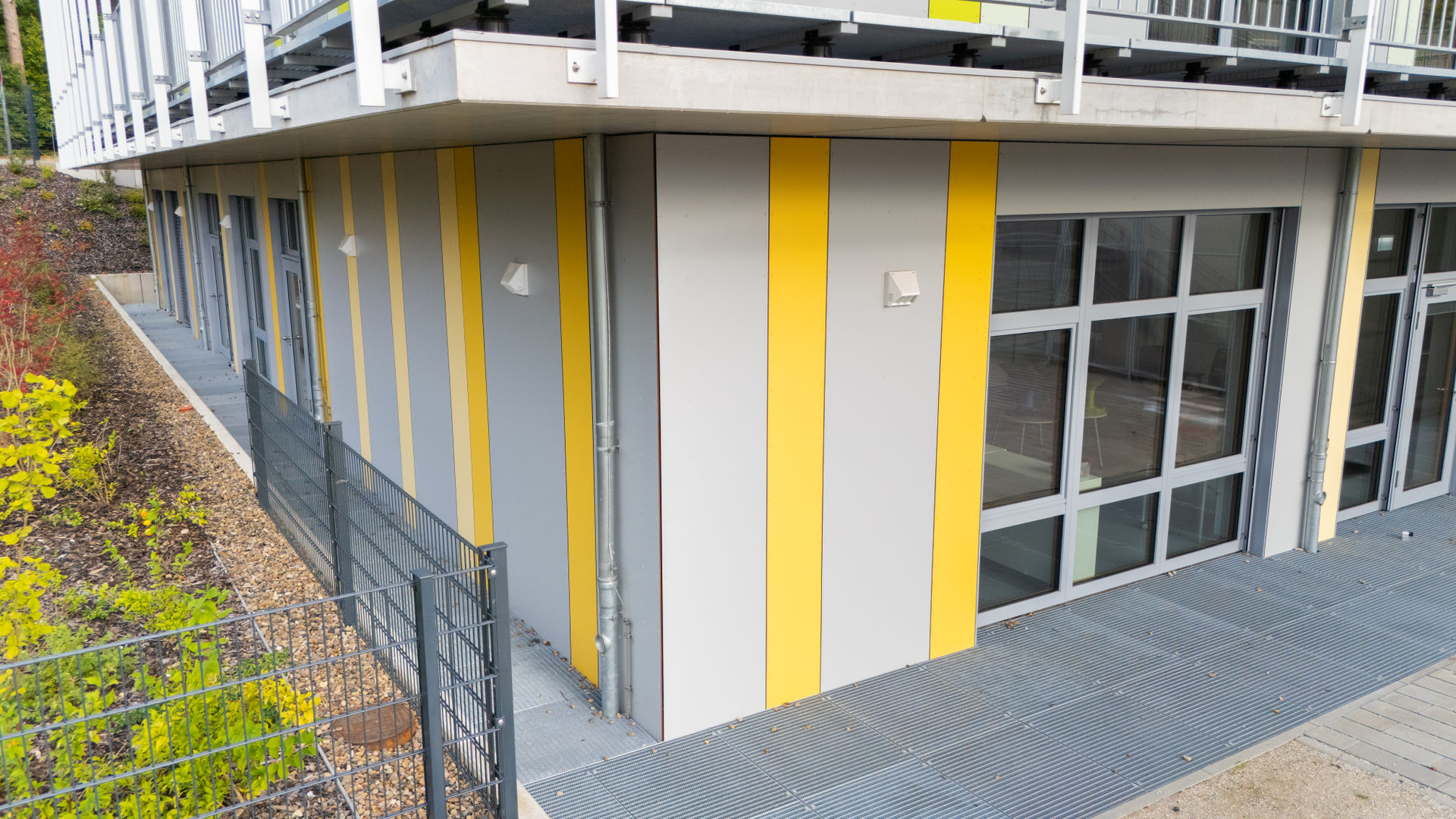 Die Südschule in Stadtallendorf entstand als Neubau mit einer Fassade aus 800 m² Fundermax-Platten. Das Material verbindet Robustheit mit gestalterischer Flexibilität und verleiht dem Gebäude eine moderne, lebendige Wirkung.