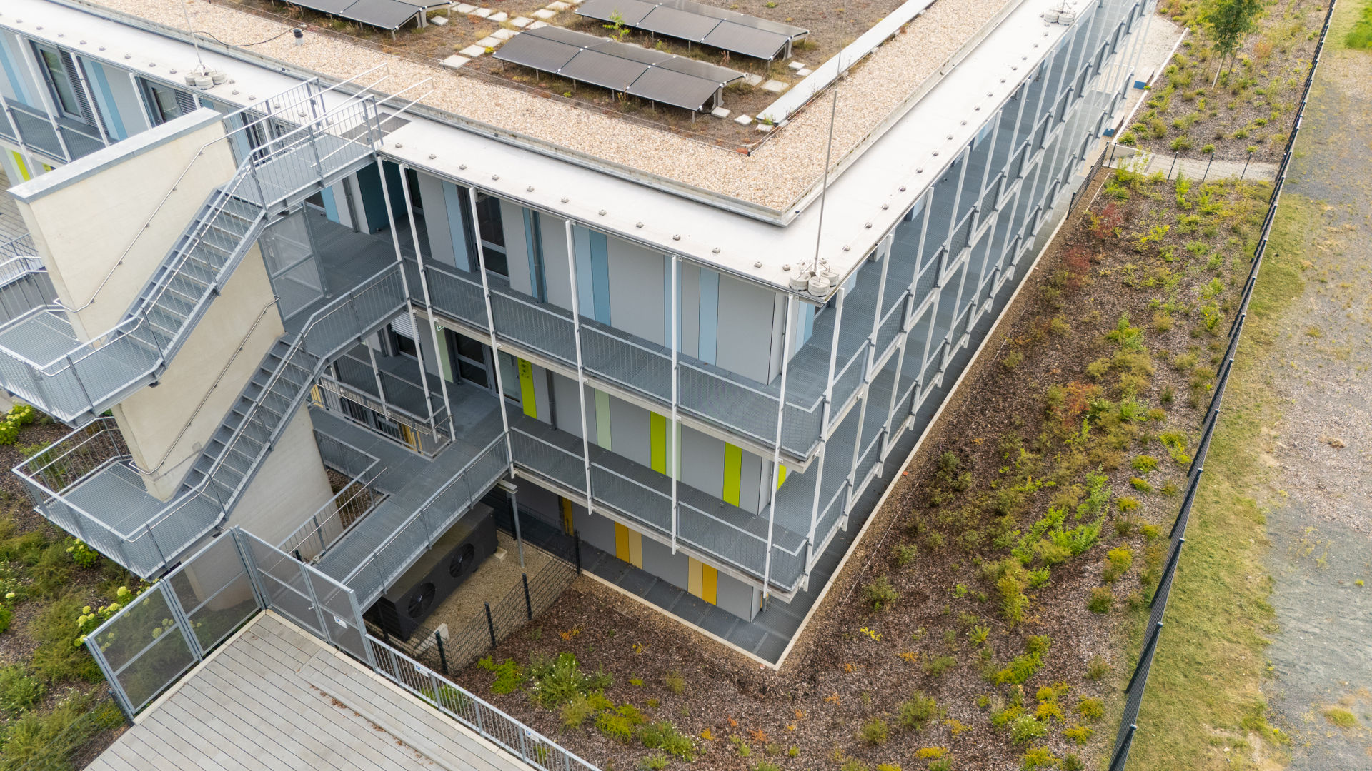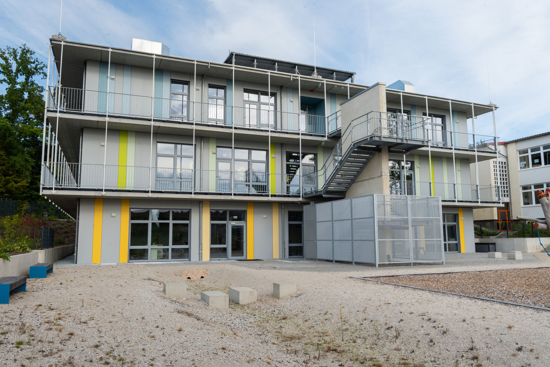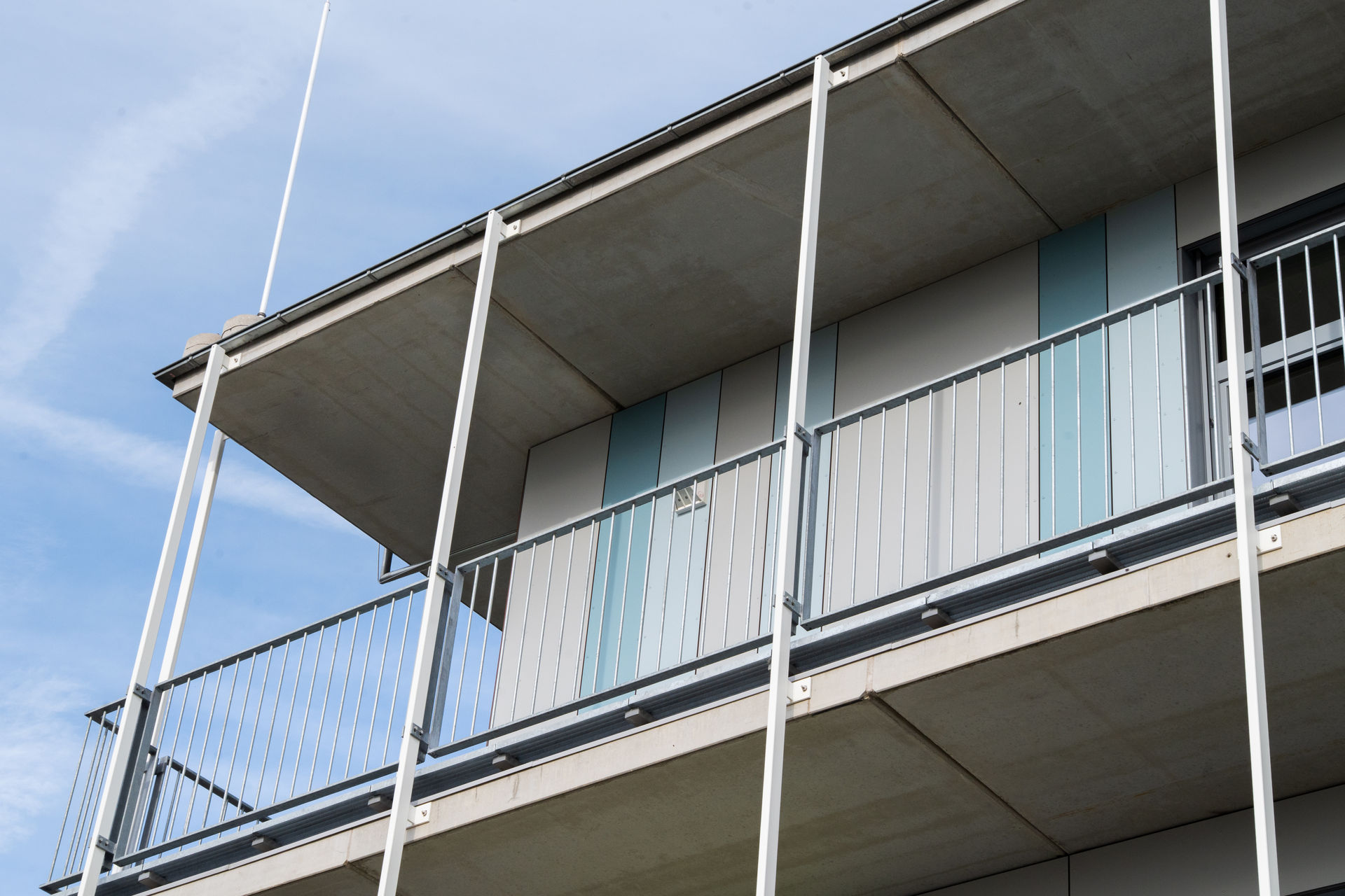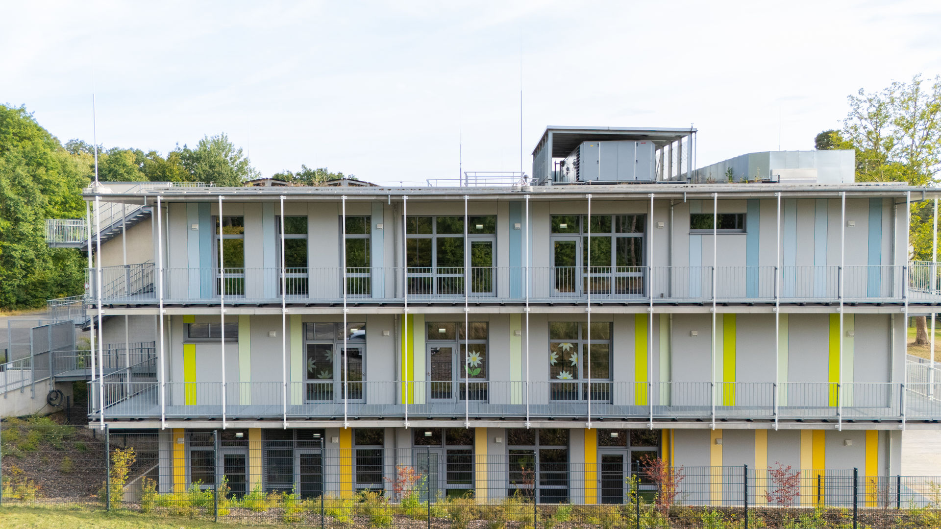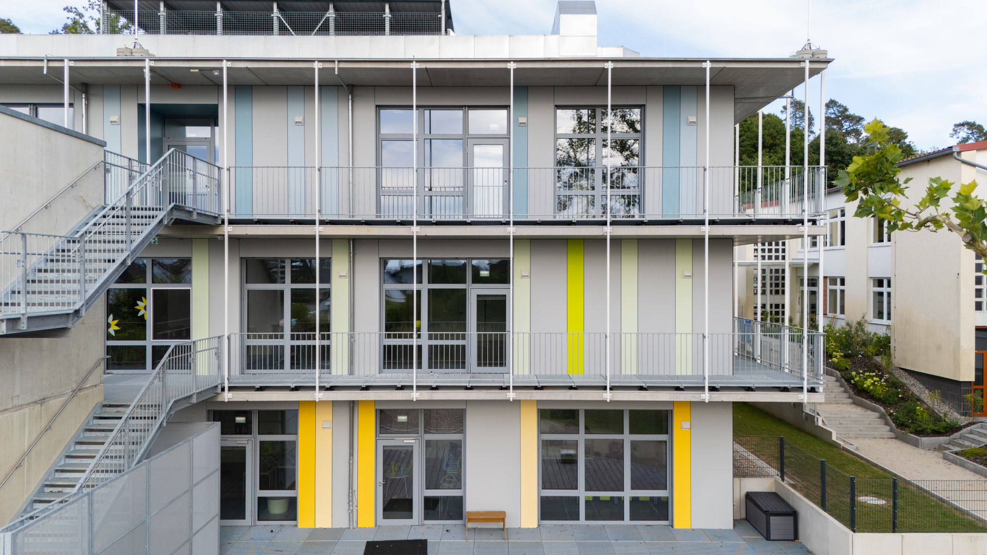 Besonders auffällig ist die Farbgestaltung: Jedes Stockwerk erhielt ein eigenes Farbkonzept, das der Fassade Rhythmus und Ausdruck verleiht. Den Haupteingang akzentuiert eine gebogene Fassadenfront, die dem Eingangsbereich eine klare Identität und Dynamik gibt.